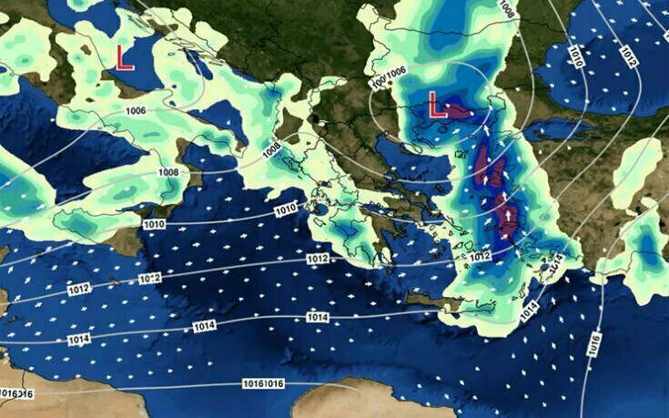 Στο βίντεο που ακολουθεί παρουσιάζεται ο υετός (βροχή/χιόνι) που αναμένεται έως τη Δευτέρα 14/12 στην Ανατολική Μεσόγειο, ο άνεμος καθώς και οι θέσες των βαρομετρικών χαμηλών (με κόκκινο “L”).