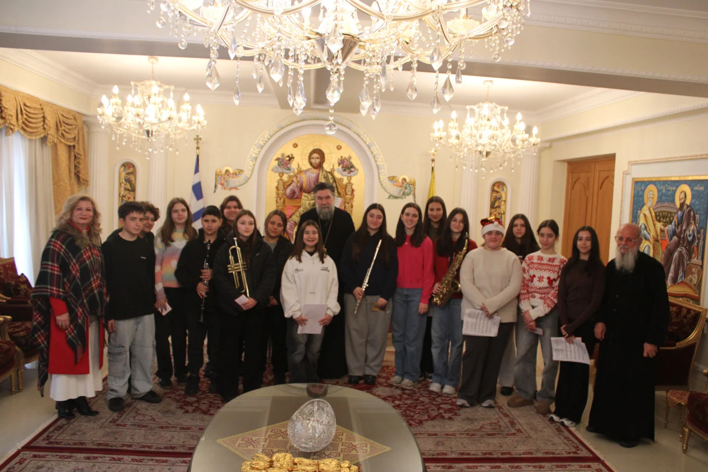Τα πατροπαράδοτα κάλαντα των Χριστουγέννων τραγούδησε μαθητική αντιπροσωπεία του Μουσικού Σχολείου Σερρών, στον Σεβ. Μητροπολίτη Σερρών και Νιγρίτης κ. Θεολόγο, σήμερα Τρίτη 23 Δεκεμβρίου 2025, στις 11:00 το πρωί, στο Επισκοπείο Σερρών.