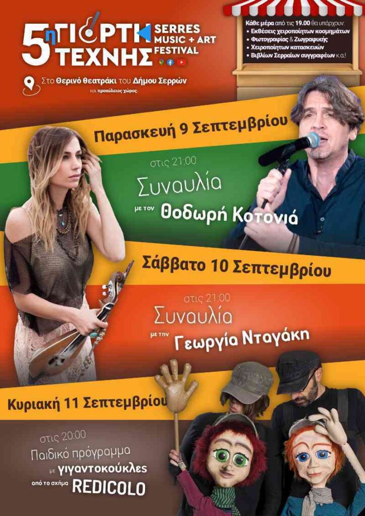 Ο Σύλλογός μας, διοργανώνει και φέτος την 5η Γιορτή Τέχνης – Serres Music and Art Festival 2022, ένα τριήμερο πολυθεματικό φεστιβάλ με μουσικές συναυλίες, παιδικό πρόγραμμα και παράλληλες εκθέσεις τέχνης, που θα πραγματοποιηθεί στις 9, 10 και 11 Σεπτεμβρίου, στο θερινό θέατρο του Δήμου Σερρών και τους γύρω χώρους.