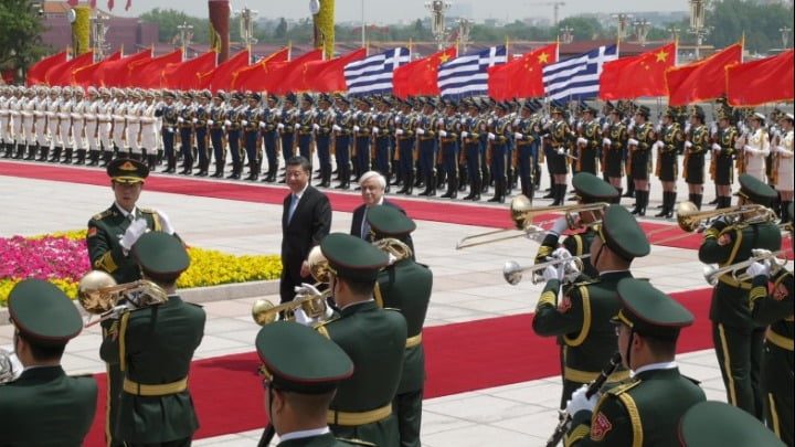 Ο Κινέζος Πρόεδρος υποδέχθηκε στην είσοδο του Μεγάρου του Λαού τον κ. Παυλόπουλο και στη συνέχεια οι δύο ηγέτες επιθεώρησαν τιμητικό άγημα της Προεδρικής Φρουράς της Κίνας, ενώ δεκάδες μαθητές και μαθήτριες, που είχαν συγκεντρωθεί έξω από το Μέγαρο του Λαού, υποδέχθηκαν τους δύο άνδρες κρατώντας στα χέρια σημαίες της Ελλάδας και της Κίνας.