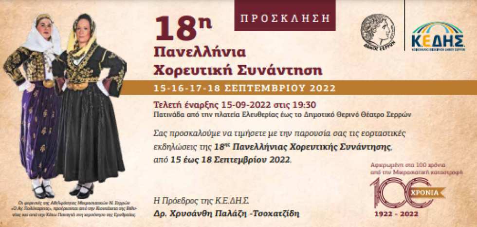 Η Κοινωφελής Επιχείρηση του Δήμου Σερρών (Κ.Ε.ΔΗ.Σ.) σε συνεργασία με το Δήμο Σερρών και τους Πολιτιστικούς Συλλόγους της πόλης των Σερρών διοργανώνει μετά από δύο χρόνια την 18η Πανελλήνια Χορευτική Συνάντηση.