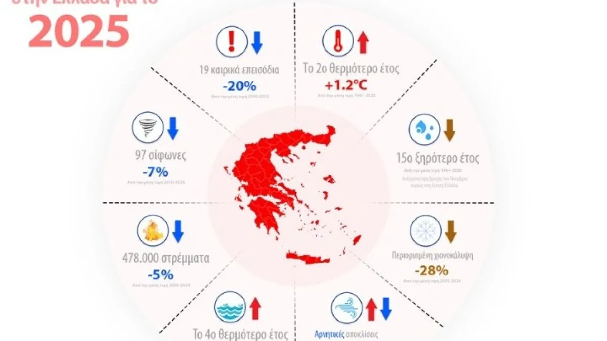 Η συνεχής αυξητική τάση της θερμοκρασίας τα τελευταία χρόνια, τα ιδιαίτερα θερμά καλοκαίρια και οι λιγότερες ημέρες χιονοκάλυψης αποτελούν τα βασικά χαρακτηριστικά της κλιματικής εικόνας της Ελλάδας, όπως αυτή διαμορφώθηκε κατά το 2025. Τα στοιχεία που παρουσίασε η ομάδα του κόμβου πληροφόρησης «Climatebook.gr» αποτυπώνουν την κλιματική αποτίμηση για τη χώρα μας για την περασμένη χρονιά. Όπως επισήμανε ο διευθυντής Ερευνών του Ινστιτούτου Ερευνών Περιβάλλοντος και Βιώσιμης Ανάπτυξης στο Εθνικό Αστεροσκοπείο Αθηνών, κι επικεφαλής της μονάδας ΜΕΤΕΟ, δρ Κώστας Λαγουβάρδος, και όπως προκύπτει από τα στοιχεία το 2025 αποτέλεσε το δεύτερο πιο θερμό έτος για την Ελλάδα τα τελευταία 30 χρόνια με μέση ετήσια τιμή της θερμοκρασίας στους 15.3 ° C, ενώ προσέθεσε ότι η μέση μέγιστη θερμοκρασία στην Ελλάδα το 2025 ήταν σε όλες τις περιοχές υψηλότερη από τη μέση τιμή της κλιματικής περιόδου 1991-2020. Ενδεικτικό της συνεχούς αυξητικής τάσης της θερμοκρασίας αποτελεί το γεγονός ότι τα 6 από τα 7 θερμότερα έτη στην Ελλάδα έχουν καταγραφεί τα τελευταία 7 χρόνια, με τα 3 θερμότερα έτη να καταγράφηκαν μόλις τα τελευταία 3 χρόνια. Παράλληλα, όπως τονίστηκε κατά την παρουσίαση της κλιματικής αποτίμησης για το 2025 το 72% των ημερών του έτους ήταν πάνω από τη μέση τιμή της περιόδου 1991-2020.