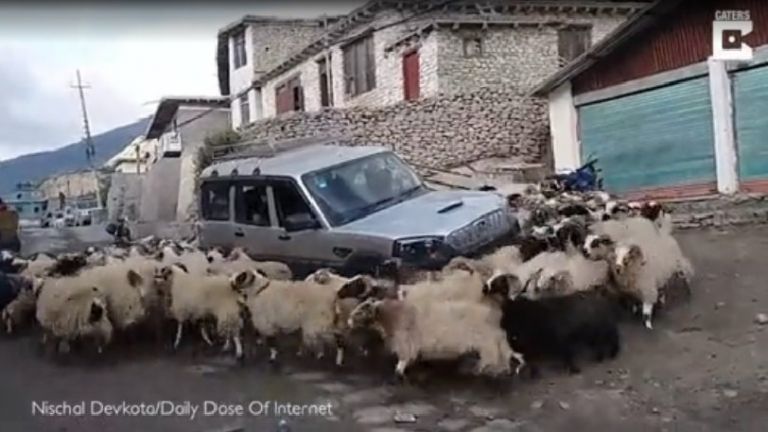 Τα έχασε εντελώς ένας οδηγός αυτοκινήτου στο Νεπάλ όταν συνάντησε απρόσμενα ένα κοπάδι πρόβατα.