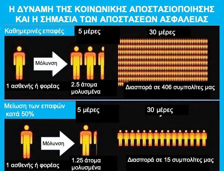Στην πρώτη στήλη ένας ασθενής ή φορέας μπορεί να μολύνει σε 5 ημέρες 2,5 άτομα και σε 30 ημέρες η διασπορά να φτάσει τους 406 συμπολίτες μας.