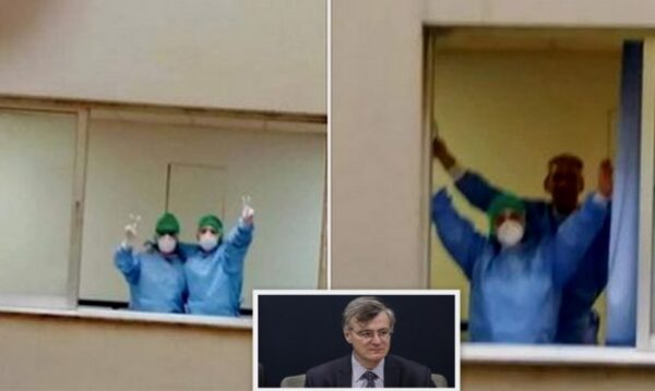 Με το σήμα της νίκης, γιατροί και νοσηλευτές χαιρετούν συναδέλφους τους από τα παράθυρα του Πανεπιστημιακού Νοσοκομείου της Πάτρας στο Ρίο, όπου τα τελευταία 24ωρα δίνουν μεγάλη μάχη με τον χρόνο και τον κίνδυνο. Οι εξαντλητικοί ρυθμοί δουλειάς, αλλά και οι ασύμετρη απειλή της νόσου που δεν έχει θεραπεία, δεν τους πτοούν.