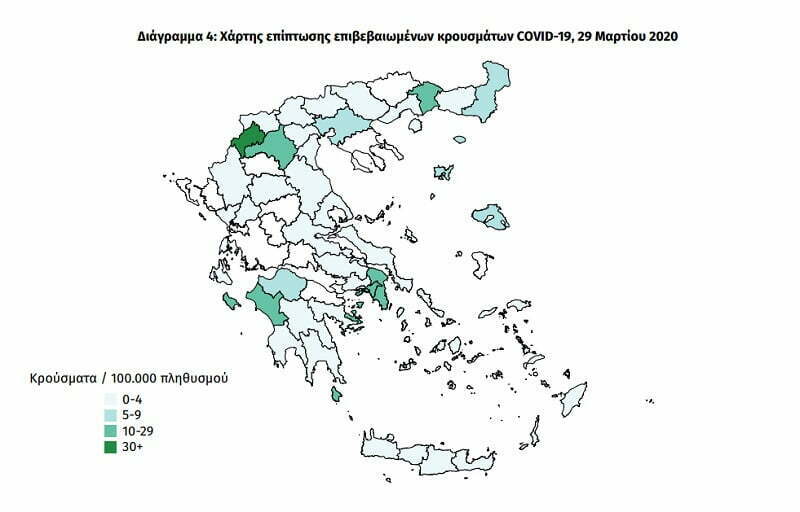 Σε αυτή την έκθεση παρουσιάζονται τα ευρήματα από την επιδημιολογική επιτήρηση της νόσου από το νέο κορωνοϊό (COVID-19) στην Ελλάδα, με βάση τα στοιχεία που έχουν δηλωθεί στον ΕΟΔΥ και καταγραφεί μέχρι τις 29 Μαρτίου 2020 και ώρα 15:00. Έχουν επιβεβαιωθεί εργαστηριακά 1.156 κρούσματα COVID-19, εκ των οποίων 95 νέα κρούσματα σε σχέση με τις 28/03/2020.