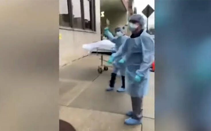 Στο οπτικό υλικό διάρκειας 5 λεπτών και 32 δευτερολέπτων φαίνονται μέλη του νοσηλευτικού προσωπικού που βοηθούν να φορτώνονται τα πτώματα σε σακούλες, σε ένα κινητό νεκροτομείο έξω από νοσοκομείο του Μπρούκλιν, όπως αναφέρει ο άνδρας που τραβάει το βίντεο.