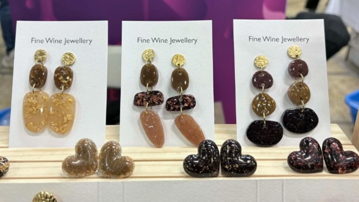 Στην οινική έκθεση Thessaloniki Wine Show, που ολοκληρώθηκε χθες στους χώρους της ΔΕΘ, ανάμεσα στα σταντ των οινοποιείων όπου οι επισκέπτες δοκίμαζαν ποικιλίες, γεύσεις και αρώματα, υπήρχε ένα που μπέρδευε ευχάριστα τον περαστικό. Σκουλαρίκια, δαχτυλίδια, κρεμαστά και μανικετόκουμπα περίμεναν από τον διερχόμενο να ανακαλύψει τη σχέση τους με το κρασί. «Περνούσαν, έβλεπαν κοσμήματα και με ρωτούσαν τι δουλειά έχουμε εδώ. Και τους έλεγα ότι έχουμε κοσμήματα με κρασί», λέει η δημιουργός τους Στέλλα Σμυρλόγλου, περιγράφοντας την πρώτη αντίδραση, την απορία που γινόταν σχεδόν πάντα έκπληξη. Ξινόμαυρο, ασύρτικο, μαλαγουζιά, μερλό, μακαμπέο, syrah ή μοσχοφίλερο, δεν βρίσκονται σε γυάλινα μπουκάλια, αλλά «ζουν» μέσα στα κοσμήματα.