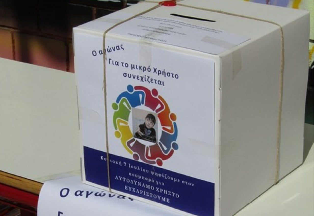 Ένας κουμπαράς περιμένει τους εκλογείς στην είσοδο των εκλογικών τμημάτων του Δήμου Κομοτηνής με σκοπό την συγκέντρωση χρημάτων για την κάλυψη μέρους των εξόδων θεραπείας του μικρού Χρήστου Θεοδωρίδη.