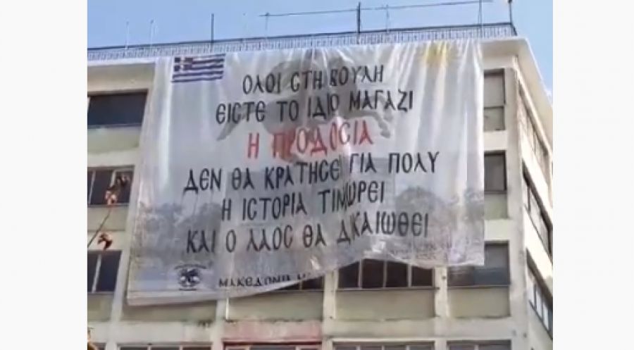 Ένα γιγαντοπανό κατά της Συμφωνίας των Πρεσπών, κρέμασαν σε κτίριο στο κέντρο της Κατερίνης, κατά τη διάρκεια της κατάθεσης στεφάνων για την επέτειο της 28ης Οκτωβρίου.