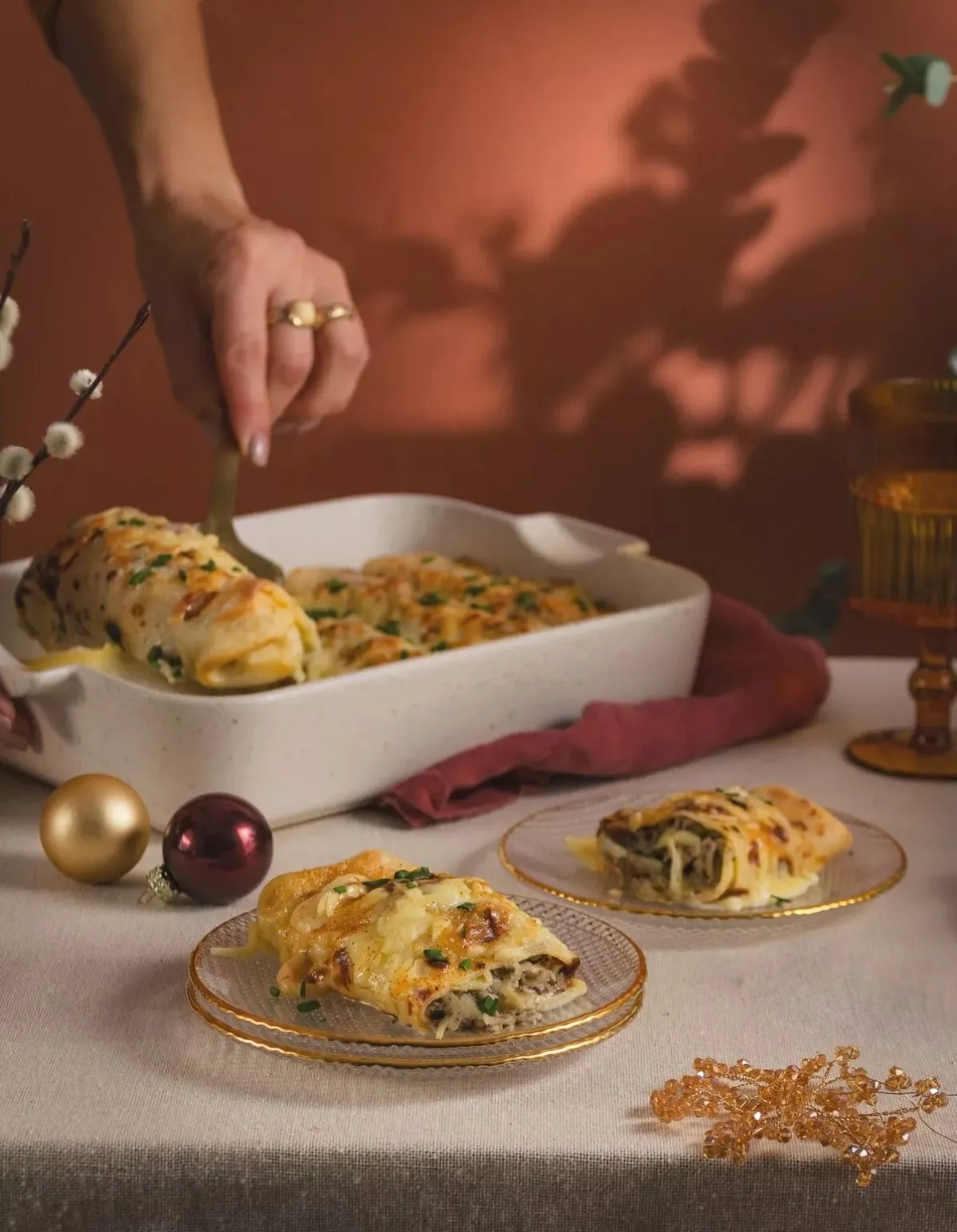 Οι αλμυρές κρέπες στον φούρνο αποτελούν μία εξαιρετική επιλογή για ένα εορταστικό μενού και οι ιδέες για τη γέμιση είναι άπειρες. Εδώ, γεμίζουμε τις κρέπες με κοτόπουλο, μήλο και διάφορα τυριά.
