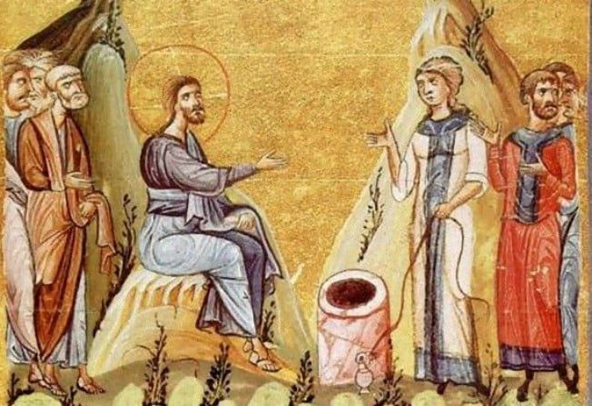 Εκεί ήταν η πηγή του Ιακώβ, το πηγάδι που εκείνος είχε ανοίξει. Κουρασμένος ο Κύριος από την οδοιπορία κάθισε μόνος του δίπλα από το πηγάδι και κάτω αφελώς, γιατί οι μαθητές του πήγαν να αγοράσουν τροφές. Έρχεται εκεί μια γυναίκα από τη Σαμάρεια να πάρει νερό και ο Κύριος διψώντας ως άνθρωπος, της ζήτησε νερό.
