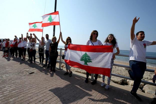 Δεκάδες χιλιάδες Λιβανέζοι σχημάτισαν σήμερα ανθρώπινη αλυσίδα 170 χιλιομέτρων κατά μήκος της ακτής της χώρας, από τον βορρά στον νότο, για να δείξουν την ενότητα και την αποφασιστικότητά τους εναντίον των πολιτικών ηγετών τους, τους οποίους κατηγορούν για διαφθορά και ότι οδηγούν τη χώρα στην οικονομική κατάρρευση.