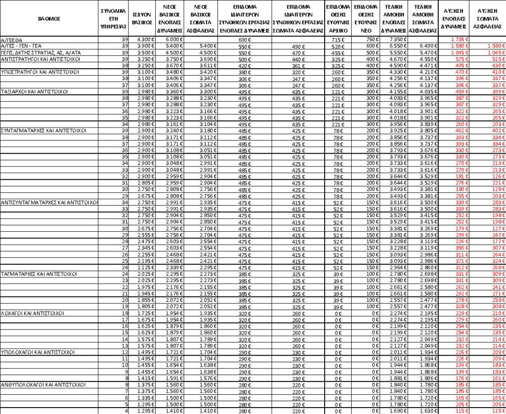 ΝΕΟ ΕΠΙΔΟΜΑ ΘΕΣΗΣ ΕΥΘΥΝΗΣ ΠΑΛΑΙΟ ΕΠΙΔΟΜΑ Α/ΓΕΕΘΑ 750 € 715 € Α/ΓΕΣ – ΓΕΝ – ΓΕΑ 600 € 520 € Υ/ΓΕΕΘΑ, Υ/ΓΕΣ, ΓΕΠΣ, ΔΚΤΗΣ ΣΤΡΑΤΙΑΣ, ΑΣ, Α/ΑΤΑ 500 € 455 € ΑΝΤΙΣΤΡΑΤΗΓΟΣ ΚΑΙ ΑΝΤΙΣΤΟΙΧΟΙ 400 € 325 € ΥΠΟΣΤΡΑΤΗΓΟΣ ΚΑΙ ΑΝΤΙΣΤΟΙΧΟΙ 350 € 260 € ΤΑΞΙΑΡΧΟΙ ΚΑΙ ΑΝΤΙΣΤΟΙΧΟΙ 300 € 221 € ΣΥΝΤΑΓΜΑΤΑΡΧΕΣ ΚΑΙ ΑΝΤΙΣΤΟΙΧΟΙ 200 € 78 € ΑΝΤΙΣΥΝΤΑΓΜΑΤΑΡΧΕΣ ΚΑΙ ΑΝΤΙΣΤΟΙΧΟΙ 150 € 52 € ΤΑΓΜΑΤΑΡΧΕΣ ΚΑΙ ΑΝΤΙΣΤΟΙΧΟΙ 100 € 39 €