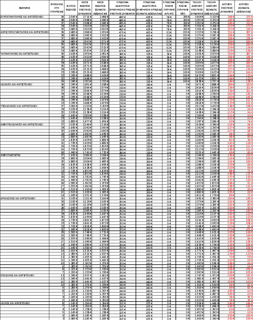 ΒΑΘΜΟΣ ΣΥΝΟΛΙΚΑ ΕΤΗ ΥΠΗΡΕΣΙΑΣ ΙΣΧΥΟΝ ΒΑΣΙΚΟΣ ΝΕΟΣ ΒΑΣΙΚΟΣ ΣΩΜΑΤΑ ΑΣΦΑΛΕΙΑΣ ΑΥΞΗΣΗ ΣΩΜΑΤΑ ΑΣΦΑΛΕΙΑΣ ΕΙΔΙΚΟΣ ΦΡΟΥΡΟΣ/ΣΥΝΟΡΙΟΦΥΛΑΚΑΣ 5 1.156 € 1.219 € 63 € 4 1.114 € 1.183 € 69 € 3 1.114 € 1.183 € 69 € 2 1.072 € 1.122 € 50 € 1 1.072 € 1.122 € 50 € 0 1.053 € 1.122 € 69 €