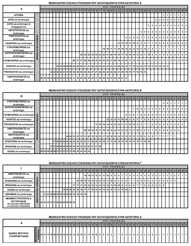 Έτη Κλιμάκιο Υποστράτηγος και αντίστοιχοι μέχρι 26 9 από 26 έως 28 8 από 28 έως 30 7 από 30 έως 32 6 από 32 και άνω 5 Ταξίαρχος και αντίστοιχοι μέχρι 24 13 από 24 έως 25 12 από 25 έως 26 11 από 26 έως 27 10 από 27 έως 28 9 από 28 έως 30 8 από 30 έως 32 7 από 32 και άνω 6