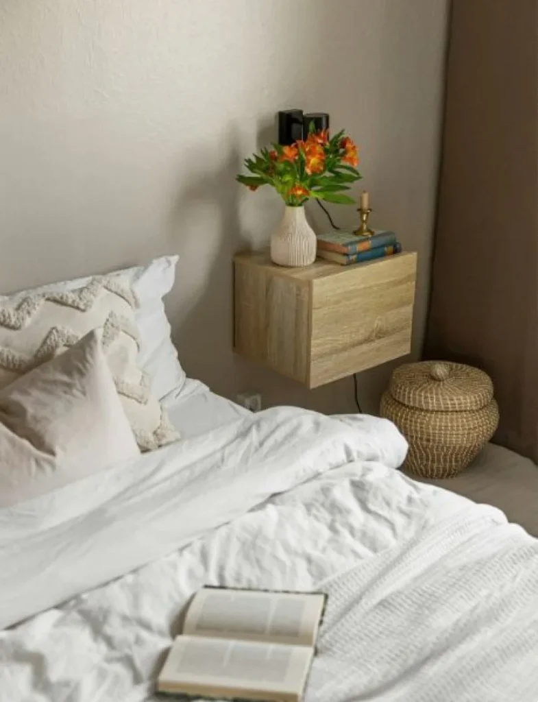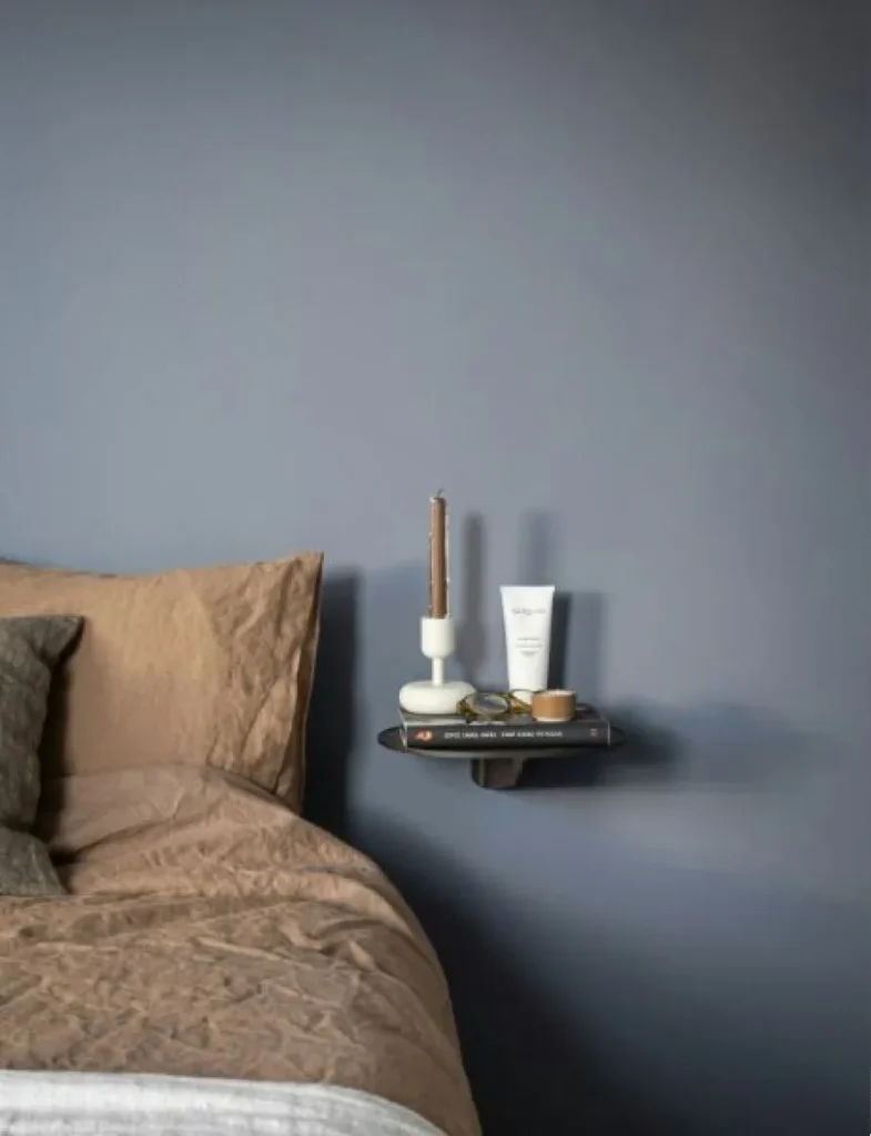 Αν ο χώρος δεν επιτρέπει κάτι παραπάνω, ένα μικρό ραφάκι στον τοίχο είναι αρκετό για να εξυπηρετεί τις βασικές σας ανάγκες και να δώσει στον χώρο μια προσεγμένη εικόνα χωρίς περιττό όγκο. Η θέση του επιλέγεται με βάση το ύψος του κρεβατιού για να είναι λειτουργικό, ενώ πάνω του τοποθετούνται τα απολύτως απαραίτητα χωρίς να δημιουργείται ακαταστασία.