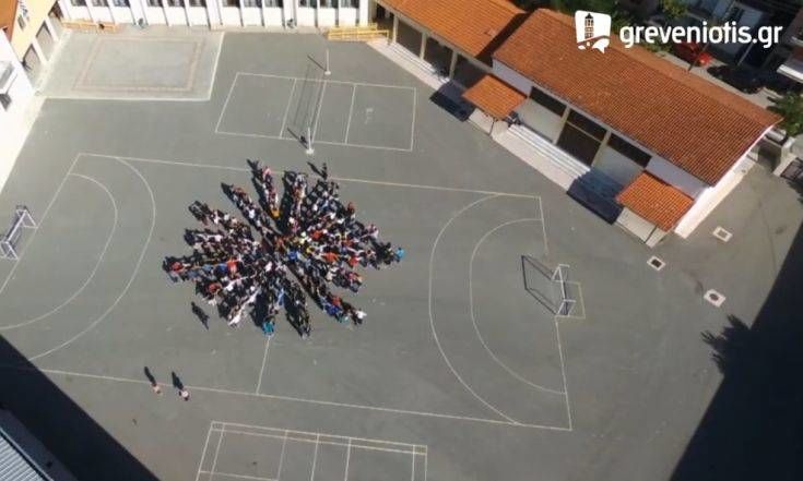 Μαθητές και μαθήτριες του 1ου Γυμνασίου Γρεβενών σχημάτισαν με τα σώματά τους τον 16κτινο Ήλιο της Βεργίνας, τραγουδώντας παράλληλα το «Μακεδονία Ξακουστή», στο πλαίσιο του εορτασμού της ημέρας του «Μακεδονικού Αγώνα».
