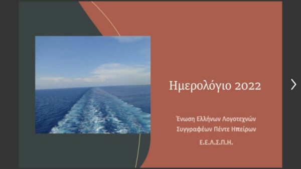 Με ένα διαδικτυακό ημερολόγιο με εικόνες από την Ελλάδα και ποιήματα μελών της υποδέχεται το νέο έτος η Ένωση Ελλήνων Λογοτεχνών και Συγγραφέων των Πέντε Ηπείρων, θέλοντας μ’ αυτόν τον τρόπο να βρεθεί κοντά στους Έλληνες όπου Γης και τη νέα χρονιά.