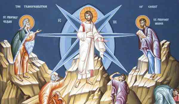 Οι τρεις μαθητές Του, όπως ήταν κουρασμένοι από τη δύσκολη ανάβαση στο Θαβώρ και ενώ κάθισαν να ξεκουραστούν, έπεσαν σε βαθύ ύπνο. Όταν, ξύπνησαν, αντίκρισαν απροσδόκητο και εξαίσιο θέαμα. Το πρόσωπο του Κυρίου άστραφτε σαν τον ήλιο, και τα φορέματα Του ήταν λευκά σαν το φως. Τον περιστοίχιζαν δε και συνομιλούσαν μαζί Του δυο άνδρες, ο Μωϋσής και ο Ηλίας (βλέπε 20 Ιουλίου). Γράφει χαρακτηριστικά ο Άγιος Νικόδημος ο Αγιορείτης: «Έφερε δε εις το μέσον τους τον Mωυσήν και τον Ηλίαν, διά να διορθώση τας σφαλεράς υποψίας, οπού είχον οι πολλοί περί αυτού. Kαθότι, άλλοι μεν έλεγον τον Kύριον, πως είναι ο Ηλίας. Άλλοι δε, πως είναι ο Iερεμίας. Διά τούτο λοιπόν επαράστησεν εις το Θαβώρ τους πρώτους και κορυφαίους Προφήτας, διά να γνωρίσουν οι μαθηταί, και διά των μαθητών όλοι οι άνθρωποι, πόση διαφορά είναι αναμεταξύ του Xριστού, και των Προφητών. O μεν γαρ Xριστός, είναι Δεσπότης. Oι δε Προφήται, είναι δούλοι. Kαι ίνα μάθουν, ότι ο Kύριος έχει την εξουσίαν του θανάτου και της ζωής. Διά τούτο, από μεν τους αποθαμένους, έφερε τον Mωυσήν. Aπό δε τους ζωντανούς, έφερε τον Ηλίαν».