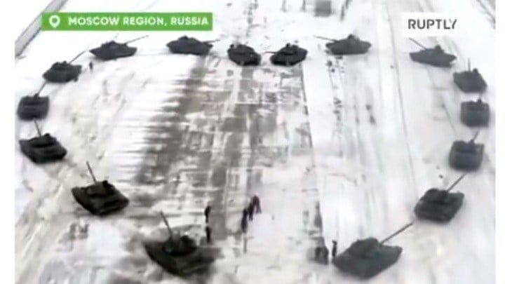 Στο βίντεο που έδωσε σήμερα στη δημοσιότητα το υπουργείο Άμυνας της Ρωσίας, διακρίνονται δεκαέξι άρματα μάχης T-72B3 να σχηματίζουν μια καρδιά στο χιονισμένο τοπίο, στη στρατιωτική βάση Αλαμπίνο, κοντά στη Μόσχα.