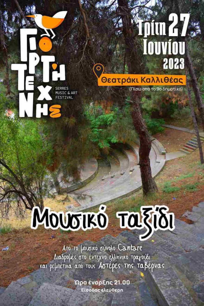 Ο σύλλογος «Γιορτή Τέχνης Σερρών» παρουσιάζει τη μουσική παράσταση “Μουσικό ταξίδι 2023”,την Τρίτη 27 Ιουνίου 2023 (ώρα 21:00), στο θερινό θεατράκι της Καλλιθέας πίσω από το 9ο Δημοτικό σχολείο.