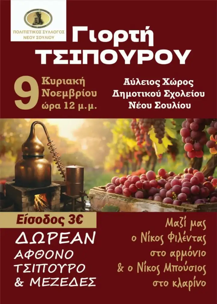 Ο Πολιτιστικός Σύλλογος Νέου Σουλίου σας προσκαλεί στη Γιορτή Τσίπουρου, την Κυριακή 9 Νοεμβρίου στις 12 μ.μ., στον αύλειο χώρο του Δημοτικού Σχολείου Νέου Σουλίου!