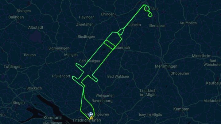 Ένας νεαρός πιλότος «ζωγράφισε» μια τεράστια σύριγγα στον ουρανό της Βαυαρίας, πραγματοποιώντας μια πτήση περίπου 300 χιλιομέτρων, με την ευκαιρία της έναρξης των εμβολιασμών για την Covid-19 στην Ευρώπη.