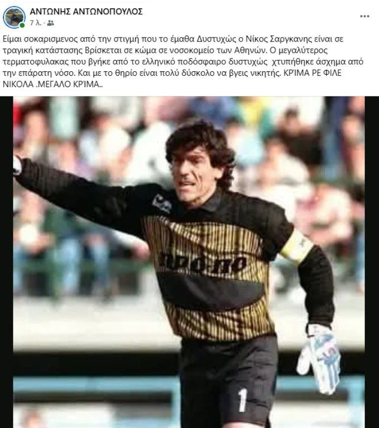 «Είμαι σοκαρισμενος από την στιγμή που το έμαθα. Δυστυχώς ο Νίκος Σαργκάνης είναι σε τραγική κατάσταση. Βρίσκεται σε κώμα σε νοσοκομείο των Αθηνών. Ο μεγαλύτερος τερματοφύλακας που βγήκε από το ελληνικό ποδόσφαιρο δυστυχώς χτυπήθηκε άσχημα από την επάρατη νόσο. Και με το θηρίο είναι πολύ δύσκολο να βγεις νικητής. ΚΡΙΜΑ ΡΕ ΦΙΛΕ ΝΙΚΟΛΑ. ΜΕΓΑΛΟ ΚΡΙΜΑ», έγραψε ο αθλητικογράφος.