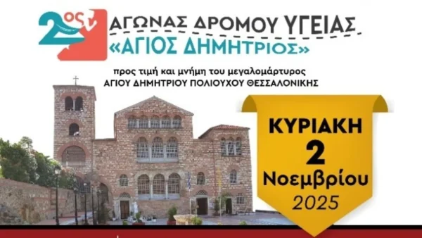 O «2ος Αγώνας Δρόμου Υγείας “Άγιος Δημήτριος” προς τιμήν του Πολιούχου της Θεσσαλονίκης, μεγαλομάρτυρα Αγίου Δημητρίου του Μυροβλύτου διοργανώνεται από την Ιερά Μητρόπολη Θεσσαλονίκης στις 2 Νοεμβρίου με στόχο την ευαισθητοποίηση σε θέματα σωματικής και ψυχικής υγείας και ευγενούς άμιλλας.