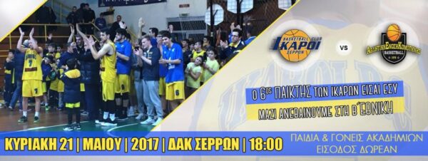 Ο Αθλητικός όμιλος καλαθοσφαίρισης (Α.Ο.Κ) Ίκαροι Σερρών, προσκαλεί όλους τους φίλους της ομάδας μας, αλλά και όλους τους φίλους του μπάσκετ, στο κλειστό γυμναστήριο της Κοιλάδας για τον αγώνα που δίνει την Κυριακή 21/05/2017 στις 18:00, με αντίπαλο την ΑΕ Κομοτηνής, στο πλαίσιο της 26ης και τελευταίας αγωνιστικής ημέρας, του πρωταθλήματος της Γ’ Εθνικής κατηγορίας.