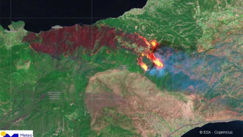 Ο ένας από τους δύο ευρωπαϊκούς δορυφόρους Sentinel-2 πέρασε το πρωί της Πέμπτης πάνω από τη Δυτική Αττική και την Ανατολική Κορινθία και κατέγραψε την καμένη έκταση, καθώς και τα ενεργά μέτωπα της μεγάλης πυρκαγιάς που μαινόταν στην περιοχή από το βράδυ της Τετάρτης.