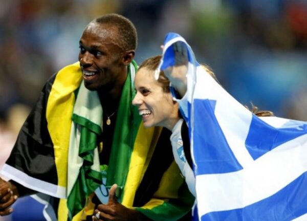 Ο Τζαμαϊκανός σπρίντερ, μόλις είχε κατακτήσει το 9ο χρυσό μετάλλιο σε τρεις συνεχόμενες Ολυμπιάδες και ο φωτογραφικός φακός τον απαθανάτισε να πανηγυρίζει αγκαλιά με την Ελληνίδα πρωταθλήτρια.