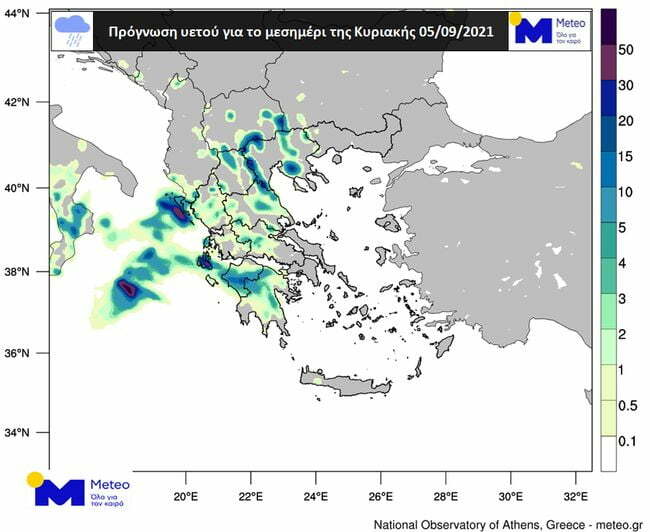 Τοπικές βροχές και καταιγίδες στα ηπειρωτικά και στο Ιόνιο αναμένονται την Κυριακή 5 Σεπτεμβρίου 2021. Μικρή πτώση της θερμοκρασίας και άνεμοι έως 7 μποφόρ στο Νοτιοανατολικό Αιγαίο.