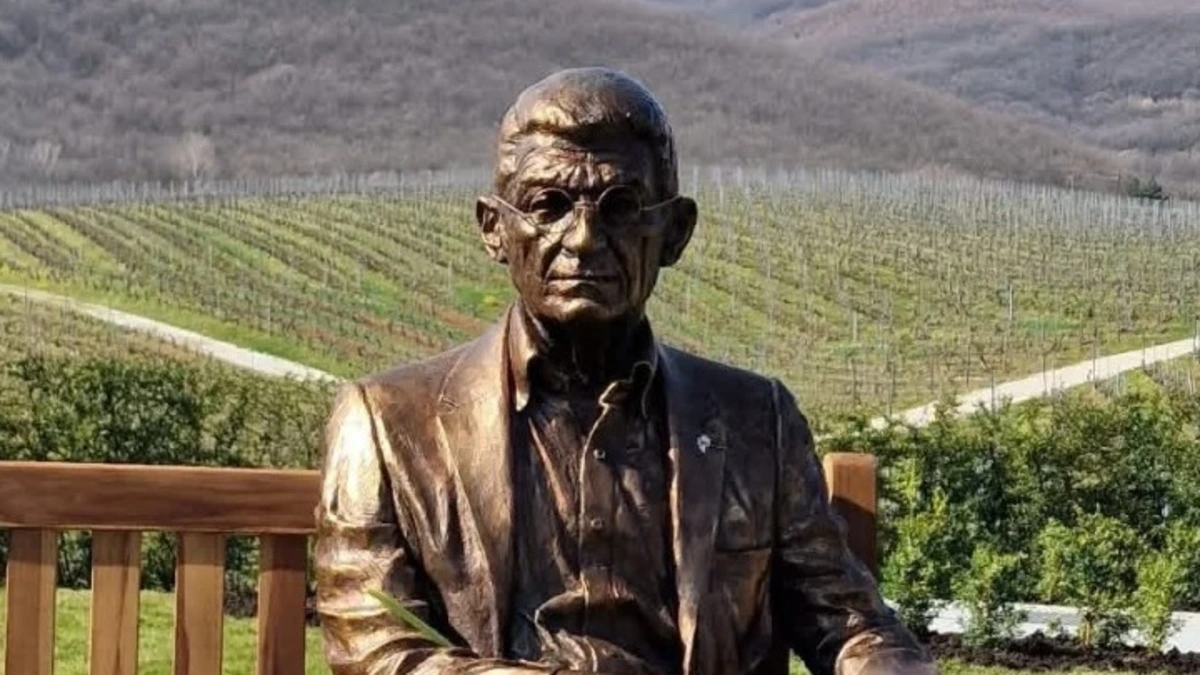 Στα αμπέλια του στο κτήμα της Νάουσας «επέστρεψε» ο Γιάννης Μπουτάρης. Η μορφή του -σε γλυπτό φυσικού μεγέθους κατασκευασμένο από ορείχαλκο- καθισμένη σε ένα παγκάκι θα καλωσορίζει εφεξής τους επισκέπτες του κτήματος.