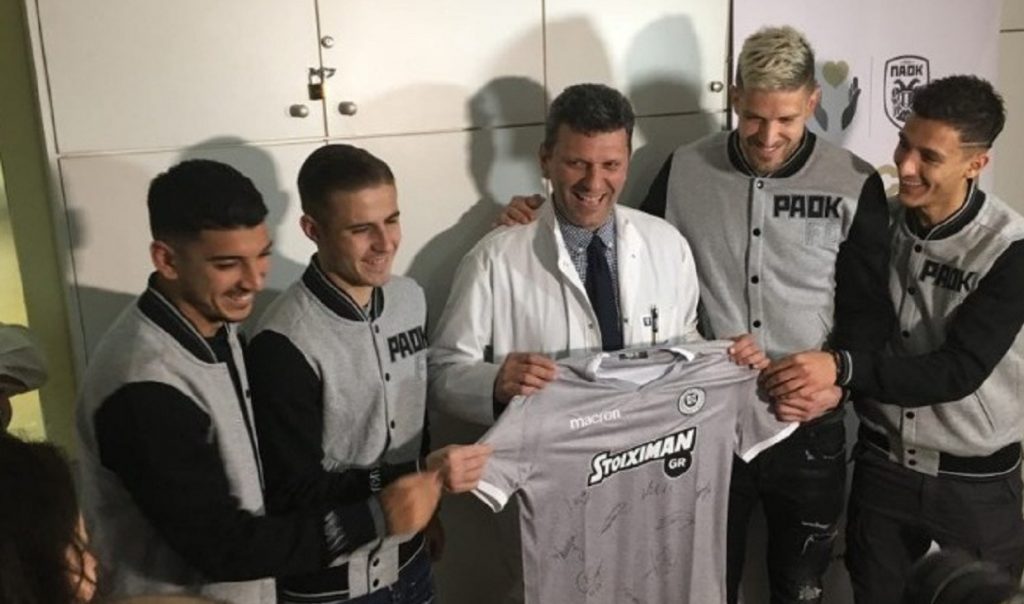 που έγινε με την παρουσία αντιπροσωπείας της λαοφιλούς ομάδας που την αποτελούσαν οι ποδοσφαιριστές Αλέξανδρος Πασχαλάκης, Δημήτρης Πέλκας, Δημήτρης Γιαννούλης και Δημήτρης Λημνιός και ο επικεφαλής του ιατρικού τιμ της ομάδας, Μανώλης Παπακώστας. Οι τέσσερις ποδοσφαιριστές του ΠΑΟΚ και αντιπροσωπεία του PAOK Action επισκέφθηκαν σήμερα το τμήμα Α’ της Ωτορινολαρυγγολογικής Κλινικής όπου και ξεναγήθηκαν από τον Δρ. Ιωάννη Κωνσταντινίδη στα εργαστήρια και τους χώρους της κλινικής.