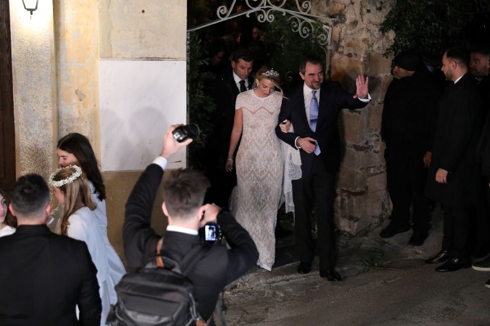 Η νύφη επέλεξε ένα δαντελένιο νυφικό σε ίσια γραμμή κεντημένο με κρύσταλλα, του γνωστού Έλληνα σχεδιαστή Χρήστου Κωσταρέλλου.