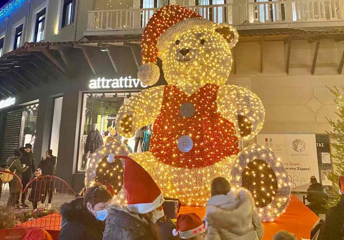 Ο «Σερρευχούλης», το γιγάντιο, φωτεινό, χαμογελαστό αρκουδάκι, αποκαλύφθηκε από τον Δήμαρχο Σερρών Αλέξανδρο Χρυσάφη χθες, Τετάρτη 16 Δεκεμβρίου υπό τους ήχους χριστουγεννιάτικων μελωδιών που τραγούδησαν παιδιά από τα ΚΔΑΠ της Κ.Ε.ΔΗ.Σ.