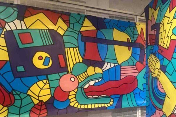 Η χαρακτηριστική τεχνοτροπία του Σωτήρη προσφέρει για ακόμα φορά ένα χαρούμενο και πληθωρικό σε σχήματα και χρώματα έργο που θυμίζει ψηφιδωτό.