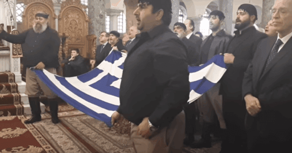 Εκεί έψαλαν τον Έθνικό Ύμνο, κρατώντας την ελληνική σημαία, μαζί με τους άλλους παρευρισκομένους στη Θεία Λειτουργία, που τελέστηκε, όπως είχε ανακοινωθεί τις προηγούμενες ημέρες, με αφορμή το σημερινό συλλαλητήριο.