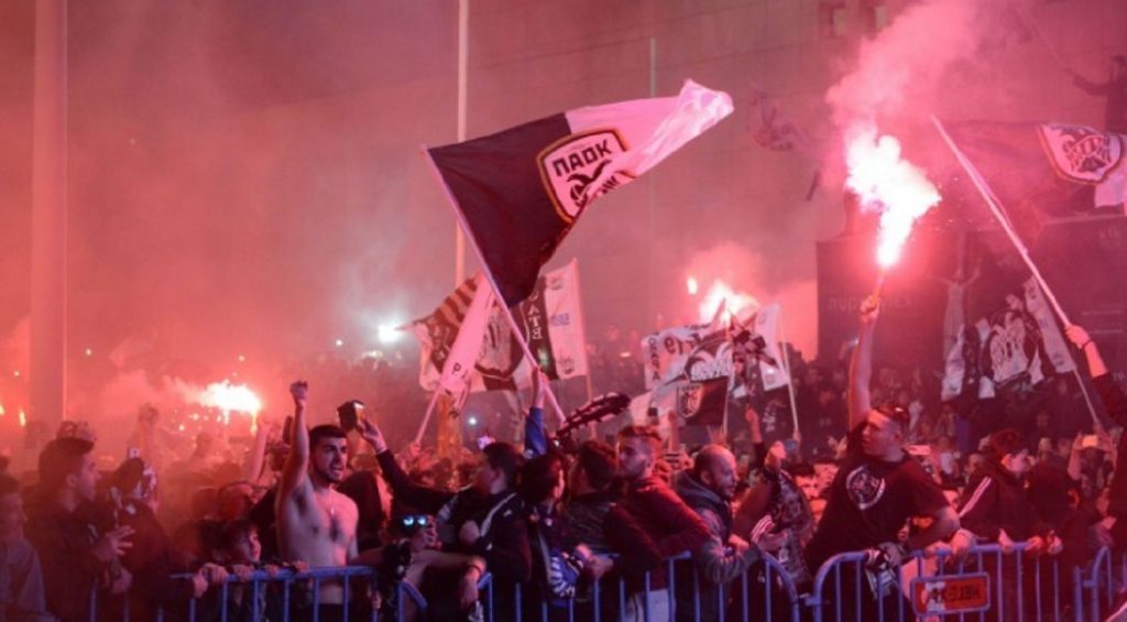 Οι 28 χιλιάδες φίλαθλοι παρέμειναν στα καθίσματα τους πέρα από έναν σημαντικό αριθμό αυτών που παρεισέφρησαν στον αγωνιστικό χώρο για να παρακολουθήσουν από κοντά την απονομή, ενώ οι βετεράνοι ποδοσφαιριστές των δυο ομάδων του ΠΑΟΚ, που κατέκτησαν τα προηγούμενα πρωταθλήματα το 1975 και το 1985, σε παράταξη εντός του γηπέδου μπροστά από την τεράστια εξέδρα που έχει στηθεί για τον σκοπό αυτό, περιμένουν την απονομή.