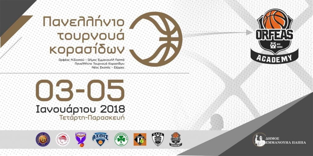 To «Πανελλήνιο Τουρνουά Μπάσκετ Κορασίδων», θα πραγματοποιηθεί στο Νέο Σκοπό Σερρών 03 με 05 Ιανουαρίου 2018, με τη συμμετοχή οκτώ εκ των μεγαλύτερων Ελληνικών ομάδων.