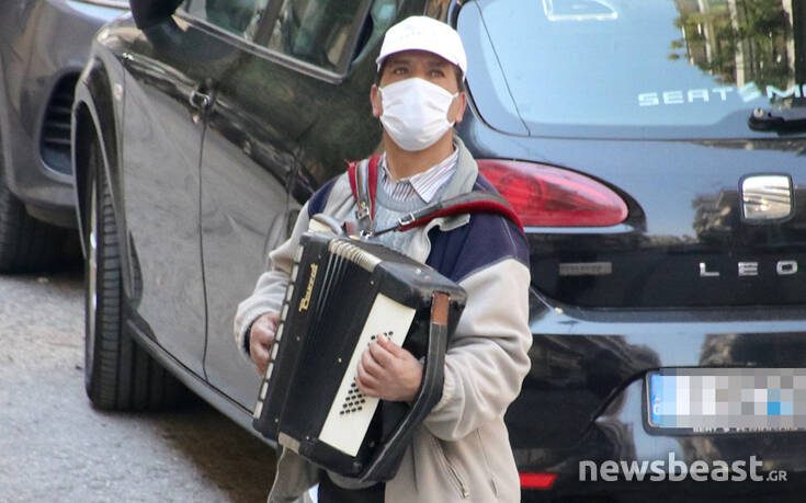 Ο άνδρας, όπως μπορείτε να δείτε από το βίντεο και τις φωτογραφίες του newsbeast.gr, κυκλοφορούσε, με τη μάσκα του, στους δρόμους έχοντας ως συντροφιά το ακορντεόν του.