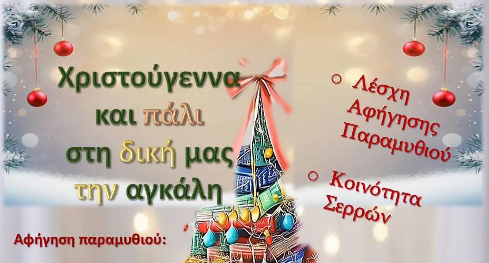 Η εκδήλωση με τίτλο «Χριστούγεννα και πάλι στη δική μας την αγκάλη», η οποία πραγματοποιείται από την Τοπική Κοινότητα Σερρών και τη Λέσχη Αφήγησης Παραμυθιού, θα «ταξιδέψει» μικρούς και μεγάλους, στον μαγικό κόσμο των παραμυθιών.