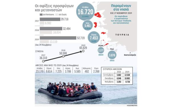 Η κατάσταση στα νησιά βρίσκεται στο χειρότερο σημείο μετά την κρίση του 2015, εφόσον στα πέντε ΚΥΤ (κέντρα υποδοχής και ταυτοποίησης ή hotspots) σε Λέσβο, Σάμο, Χίο, Κω, και Λέρο παραμένουν 35.687 αιτούντες άσυλο, ενώ την ίδια στιγμή στους 29 καταυλισμούς που βρίσκονται στην ενδοχώρα διαμένουν περίπου 22.200 άτομα.