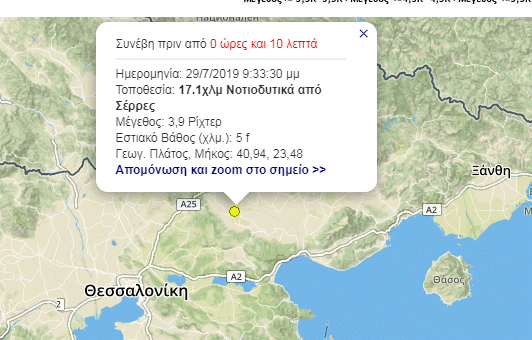Σεισμική δόνηση μεγέθους 3,9 βαθμών της κλίμακας ρίχτερ σημειώθηκε πριν από λίγη ώρα στις Σέρρες. Το επίκεντρο του σεισμού, εντοπίζεται 17 νοτιοδυτικά των Σερρώνκαι το εστιακό του βάθος ήταν 5 χιλ