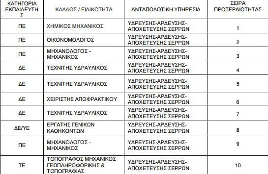 Η ΔΕΥΑ Σερρών εγκρίνει την πρόσληψη 10 εργαζομένων, η ιεράρχηση των αιτουμένων, προς κάλυψη θέσεων ανάλογα ανάλογα με το βαθμό αναγκαιότητας περιγράφεται στον πίνακα.