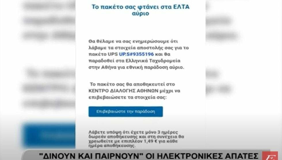 Αρκετοί είναι οι πολίτες που έλαβαν μήνυμα στο οποίο αναγράφετε πως «το πακέτο σας φτάνει στα ΕΛΤΑ αύριο» χωρίς όμως να περιμένουν πακέτο από κάποιον και ενημερώνει το υποψήφιο θύμα ότι το εν λόγω πακέτο θα αποθηκευτεί στο ΚΕΝΤΡΟ ΔΙΑΛΟΓΗΣ ΑΘΗΝΩΝ μέχρι να επιβεβαιώσετε τα στοιχεία του επισημαίνοντας μάλιστα στο υποψήφιο θύμα πως έχει μόνο 3 ημέρες δωρεάν αποθήκευσης και στη συνέχεια θα χρεωθεί με επιπλέον 1,49 € για κάθε ημέρα αποθήκευσης.