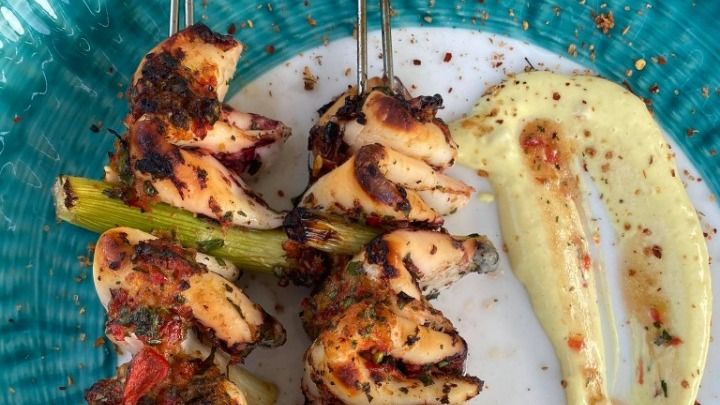«Μαγειρέψαμε ένα κοντοσούβλι καλαμάρι, το οποίο είχε προετοιμαστεί σε μία ενδιαφέρουσα μαρινάδα με φρέσκο τζίντζερ, χυμό και ξύσμα από λεμόνι, ελαιόλαδο και τσίλι και το συνοδεύσαμε με μία σάλτσα αγιολί, δηλαδή μια μαγιονέζα με σκόρδο που φτιάχνουν συνήθως στα Επτάνησα και τη Δυτική Ελλάδα», εξηγεί η meat & fire chef Μυρσίνη Λαμπράκη, η οποία εμπνεύστηκε το πιάτο. «Συνοδεύσαμε το κοντοσούβλι καλαμάρι με μία σαλάτα, όπου συνδυάσαμε καρπούζι, ντομάτα, δυόσμο, ελαιόλαδο και ψητό χαλούμι», συμπληρώνει το δεύτερο μέλος της ελληνικής αποστολής, Αλέξανδρος Πράντζος.
