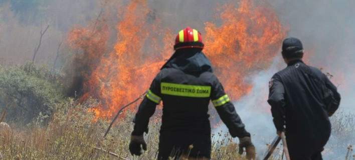 Στο σημείο επιχειρούν 15 οχήματα με 32 πυροσβέστες, ένα ελικόπτερο και εθελοντικές ομάδες.